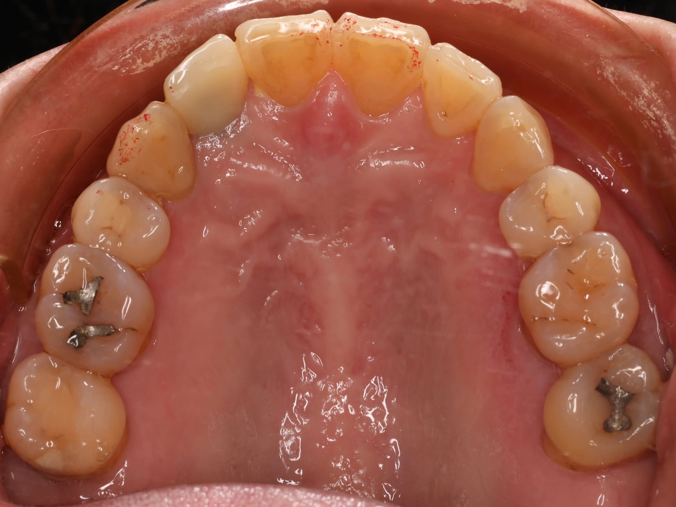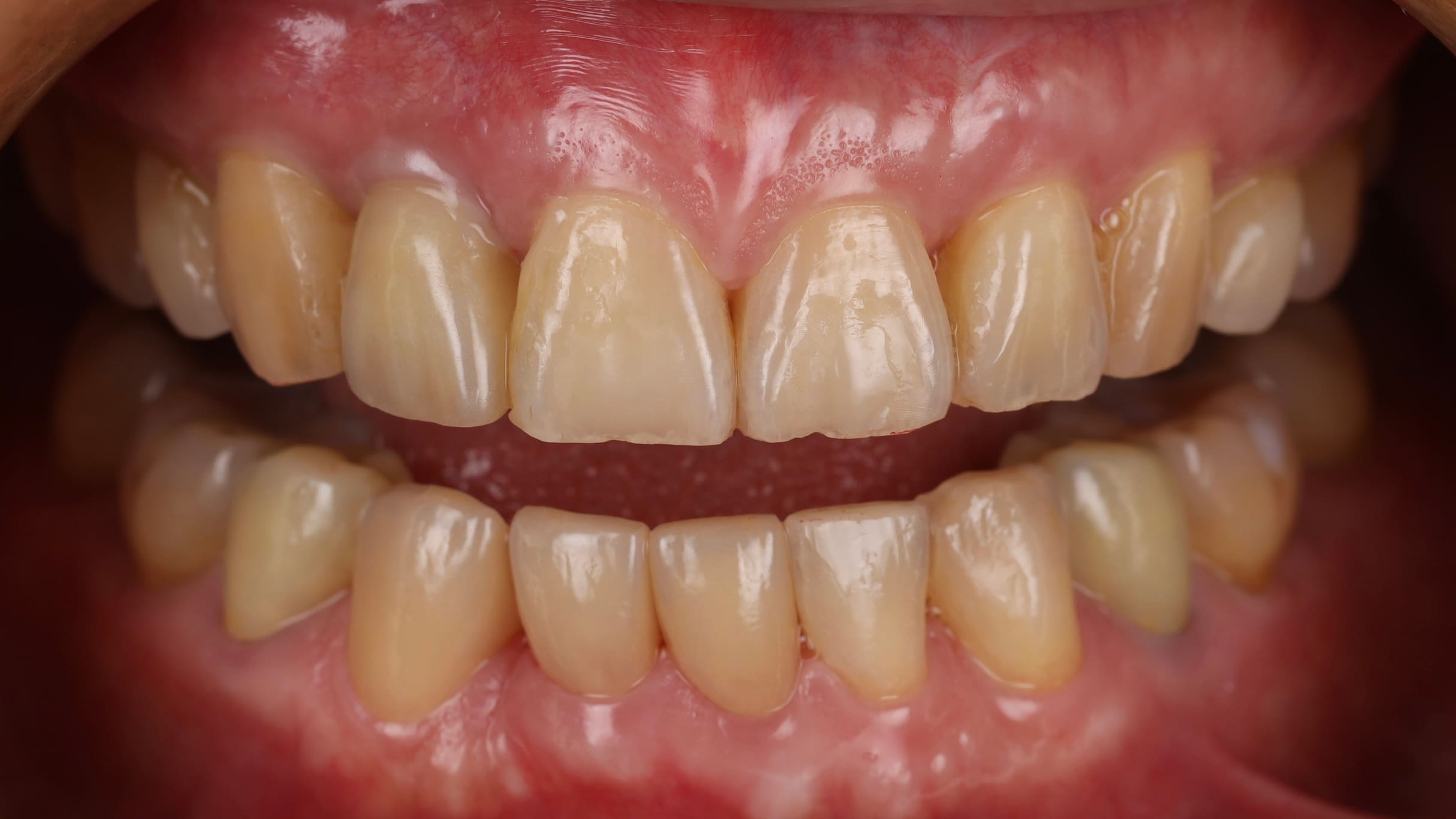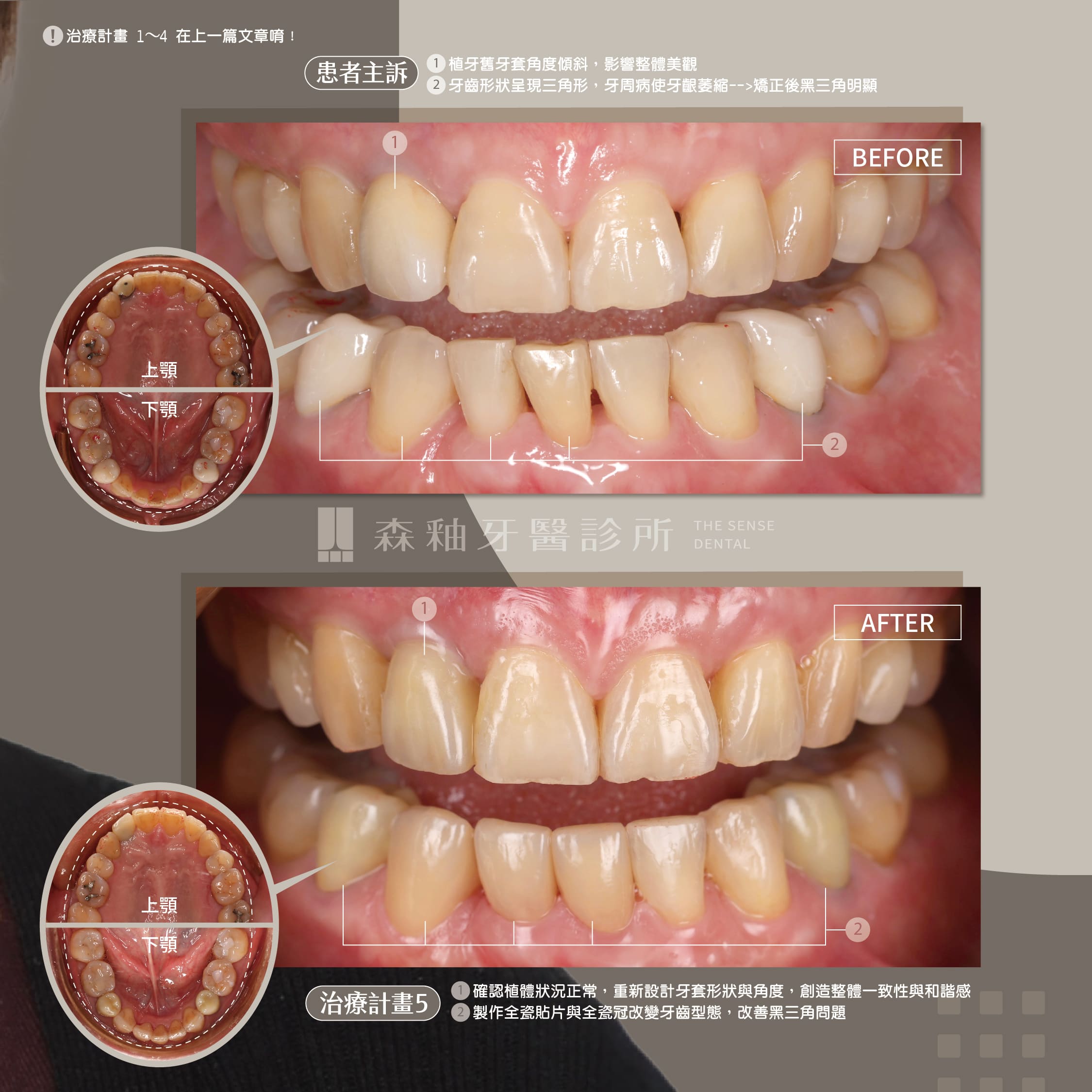 由於患者的牙齒天生形狀偏三角形,又因為牙周病造成牙齦萎縮。之前因為下排牙齒擁擠,這個問題並不明顯,但當矯正完成、牙齒排列恢復正常後,牙縫間的空隙反而特別顯眼。因此在整個治療的最後一步,我們利用全瓷貼片改變牙齒的形狀,讓牙齒變得更方正,並有效改善黑三角問題,達到整體外觀的和諧一致。