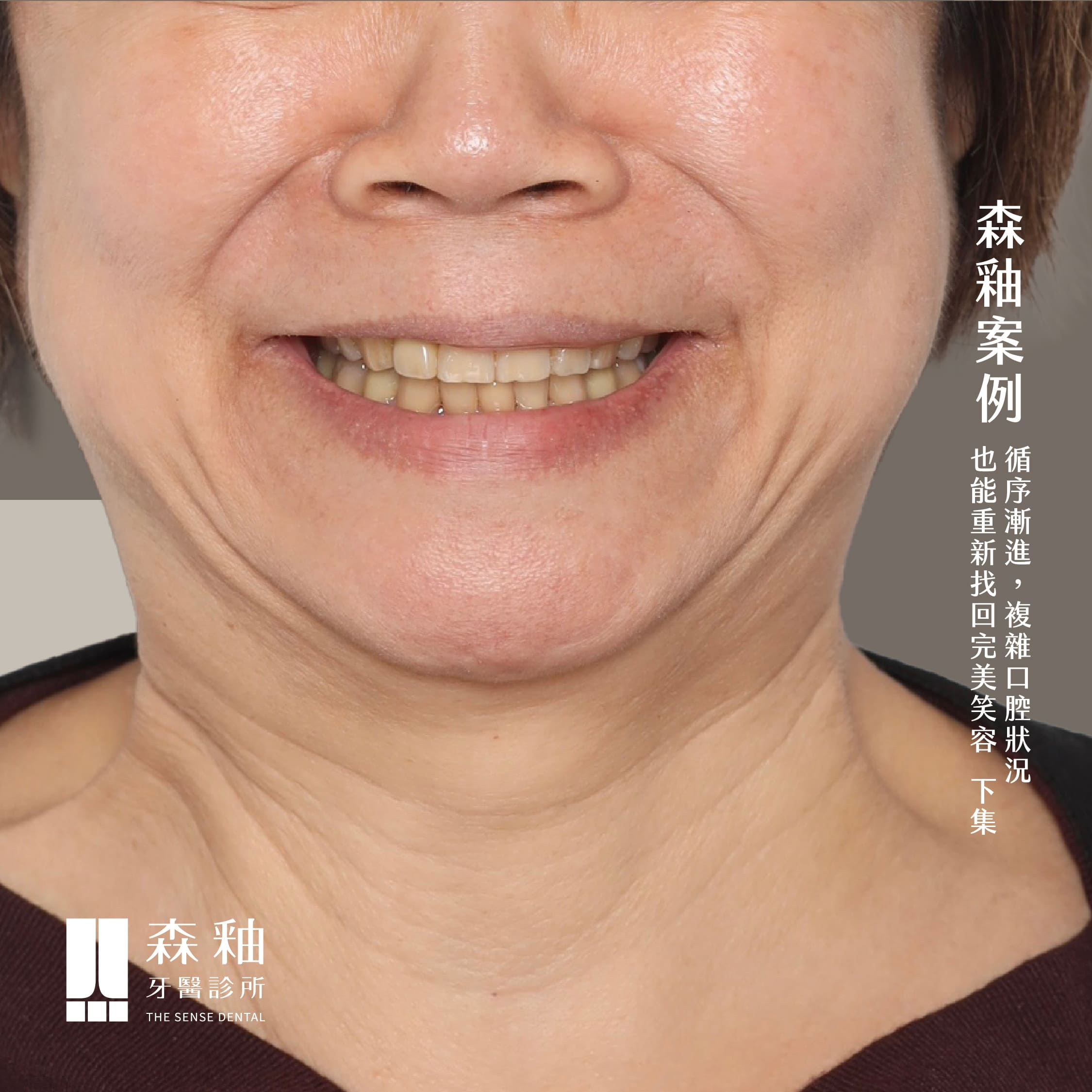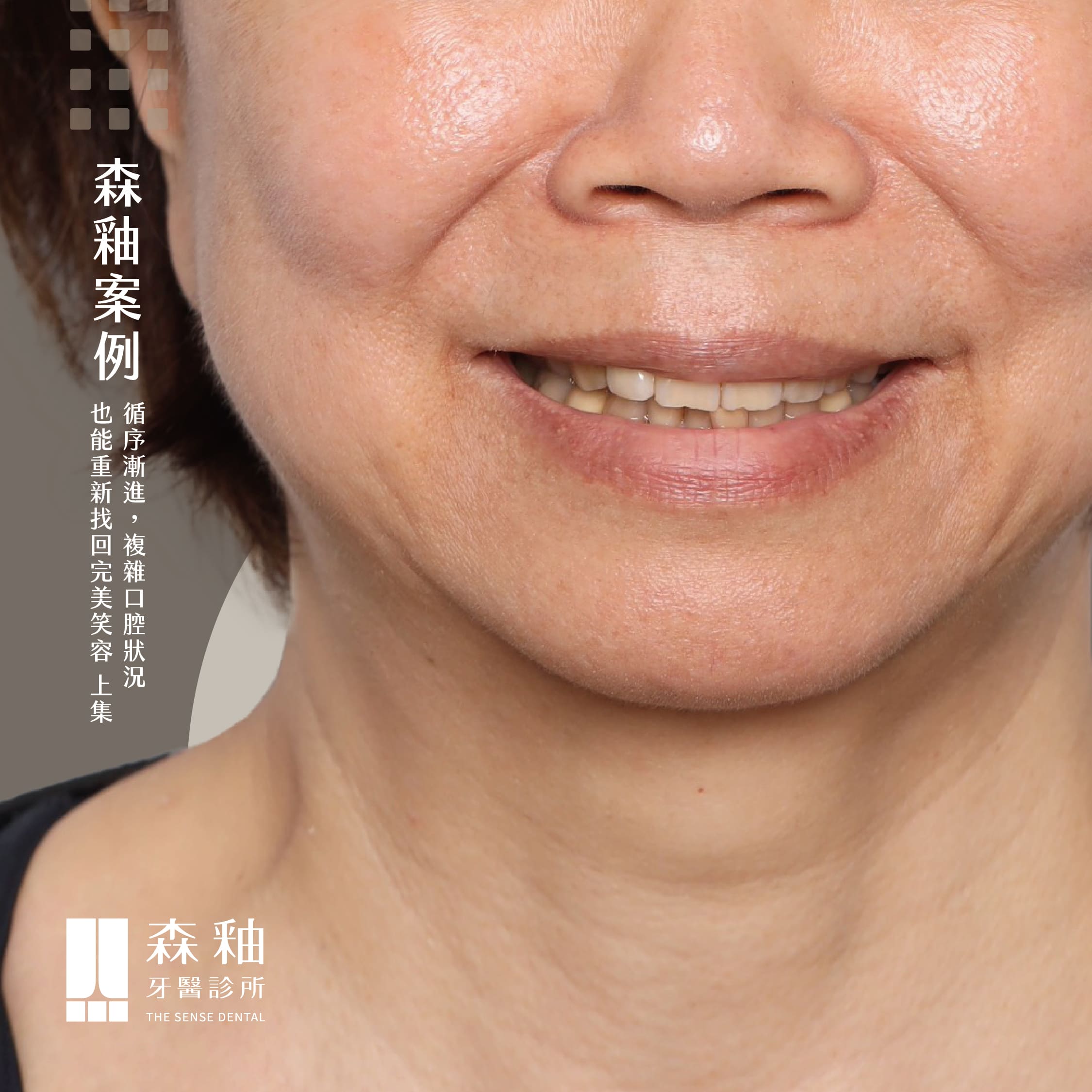 這位患者的完整治療歷程總共花了將近兩年半的時間,雖然治療時間較長,但患者對於最終的成果非常滿意,不僅恢復了口腔的健康,整體的笑容也更加和諧自然。在治療的每個階段,我們都會非常詳細地向患者說明,讓她能夠充分理解並放心地配合療程。這份信任與耐心,最終成就了這個令人滿意的結果。複雜的口腔狀況確實需要時間和耐心,但只要循序漸進、按部就班地治療,每個人都有機會重新找回屬於自己的完美笑容!