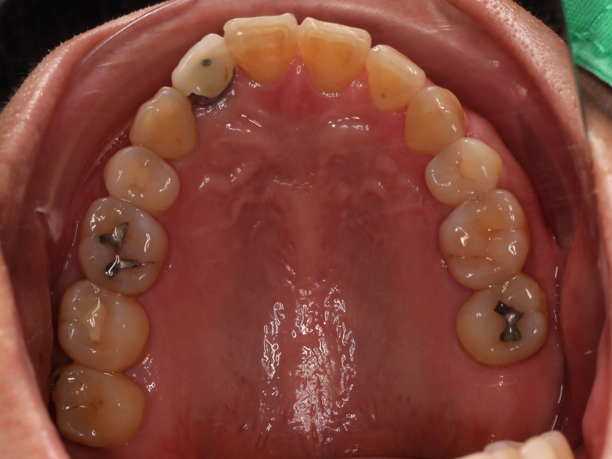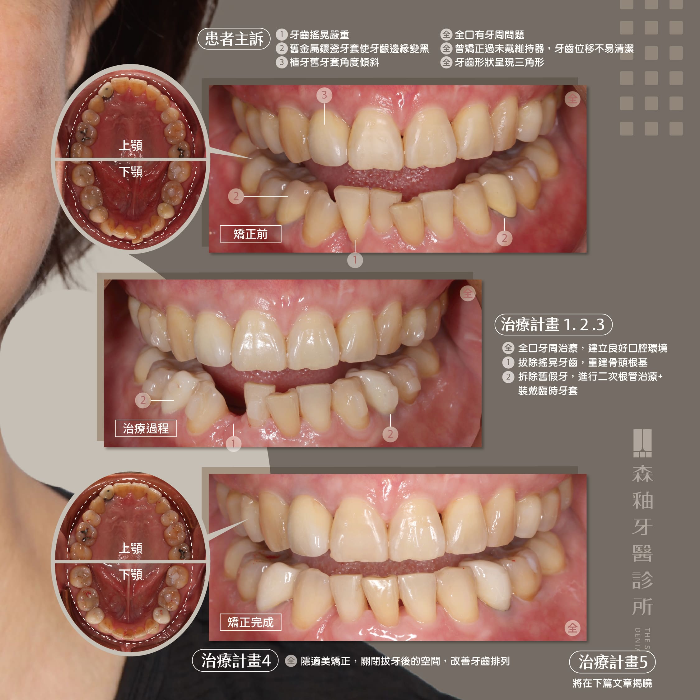 首先是 牙齒排列不整,她年輕時曾接受過矯正治療,但因為沒有持續佩戴維持器,導致牙齒在不知不覺間位移,不僅影響外觀,也讓日常清潔變得困難。再來是 牙周病問題,雖然患者有在其他診所進行治療,但由於右下側有一顆牙齒搖晃得非常厲害,牙周破壞的情況相當嚴重,原本的醫師告知她可能無法保留。最後是 舊假牙美觀不佳 的問題,患者的右上側門牙曾做過植牙治療,但牙套的角度讓牙齒看起來有些傾斜,並非正對前方,視覺上顯得不協調。此外,口內還有一些早期製作的舊牙套,邊緣都露出黑黑的金屬邊,每次張嘴說話都感到不自在。